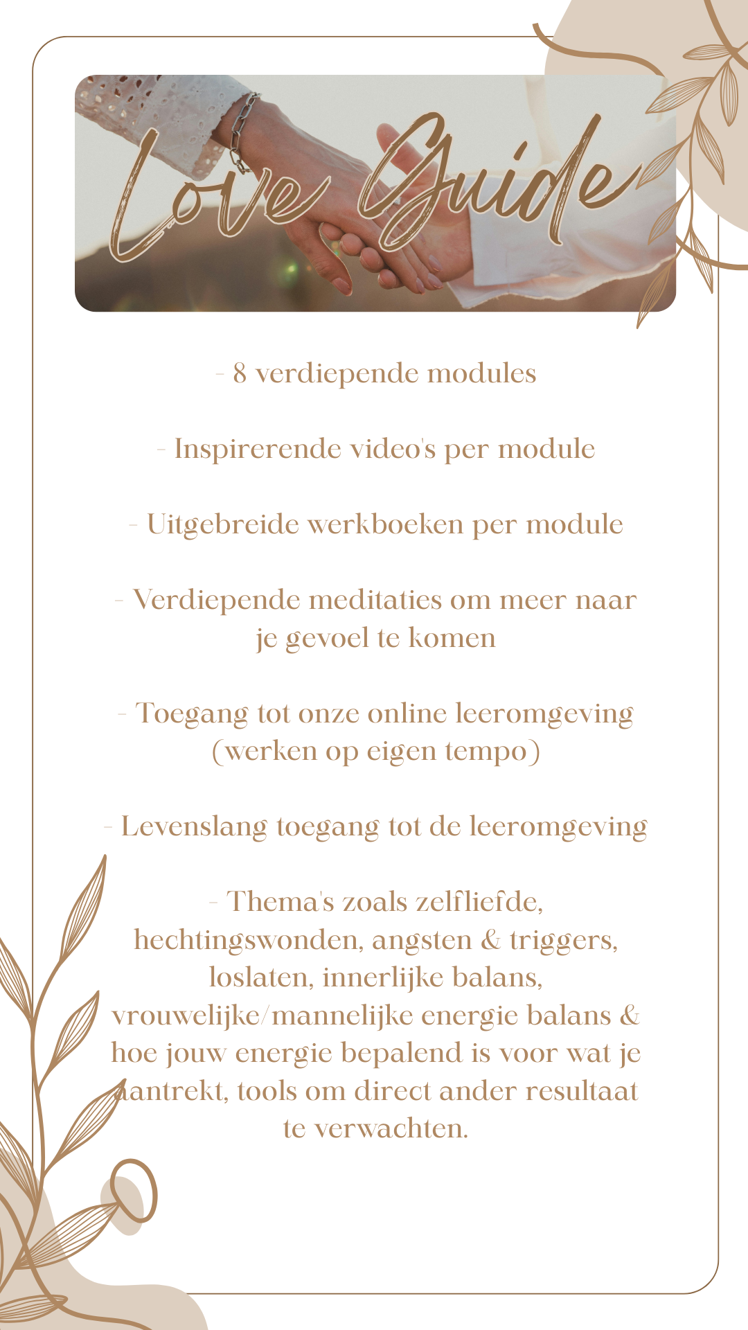 De Love Guide bestaat uit 8 modules. De meeste deelnemers doen er gemiddeld 4 weken over, meestal ongeveer 2 modules per week.